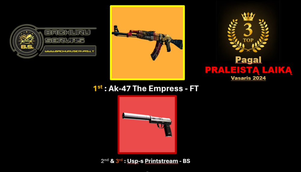 Bachūrų servo MĖNESIO BEST eventas! Balandžio MĖNUO Kviečiame visus prisijungti į mūsų PUBLIC serverį, kur vyks dar vienas MĖNESIO BEST eventas! Serverio IP: cs.bachuruservas.lt:27035 Tai jau trečias iš eilės toks eventas. Mėnesio pabaigoje bus apdovanoti TOP 3 geriausi žaidėjai pagal taškus (rank) bei TOP 3 geriausi žaidėjai pagal serveryje praleistą laiką. Savo poziciją pagal taškus galite sekti serveryje parašę !rank arba https://stats.bachuruservas.lt/toppoints/. Savo poziciją pagal laiką galite sekti https://stats.bachuruservas.lt/toppoints/?filter=playtime (pasirinkite, kad žaidėjus išdėstytų pagal PLAYTIME). Laimėtojai bus paskelbti “MĖNESIO BEST” Bachūrų servo discord’o kanale https://discord.gg/dDZfz5XV STARTAS: Balandžio 1 d. 0:00 PABAIGA: Balandžio 30 d. 21:00 SVARBU: Ankstesnių mėnesių prizininkai GALI pretenduoti į apdovanojimus ! Adminai dėl prizų nesivaržo (jei bet kuris iš administracijos bus top3, prizai atiteks atitinkamai žemiau reitinge esančiam žaidėjui(-ams)) Taškų ir/ar praleisto laiko "farminimas" (pvz., per naktį paliekamas afk ar nuolatinis leidimas draugui būti nušautam ir pan.) = BAN !!! Žaiskite sąžiningai! Evente taip pat galios visos įprastos Bachūrų servo taisyklės: TAISYKLĖS Vienas žaidėjas gali pretenduoti tik į vieną prizų kategoriją (pvz., jei esate top3 tiek pagal praleistą laiką, tiek pagal taškus, galėsite atsiimti prizą tik už vieną iš kategorijų, o nepasirinktos kategorijos prizas atiteks sekančiam pagal reitingą žaidėjui). PRIZAI: Pagal taškus Pagal praleistą laiką Sėkmės! REZULTATAI Pagal taškus: 1. vt - Rookie (12627 pt) - AK47 Aquamarine Revenge 2. vt - bart (10617 pt) - M4A1-S Atomic Alloy Neon Rider 3. vt - d a n y o o h (9387 pt) - Deagle Ocean Drive Pagal praleistą laiką: 1. vt - T.R (142 h) - AWP Duality ST. 2. vt - nepo (102 h) - Deagle Corinthian ST 3. vt - Malibu Stacy (91 h) - USP-S Cortex P.S. Tiek pagal taškus, tiek pagal praleistą laiką puikiai pasirodė gez! Bet, deja, jis adminas... Dėl prizų kreipkitės pas @kanno