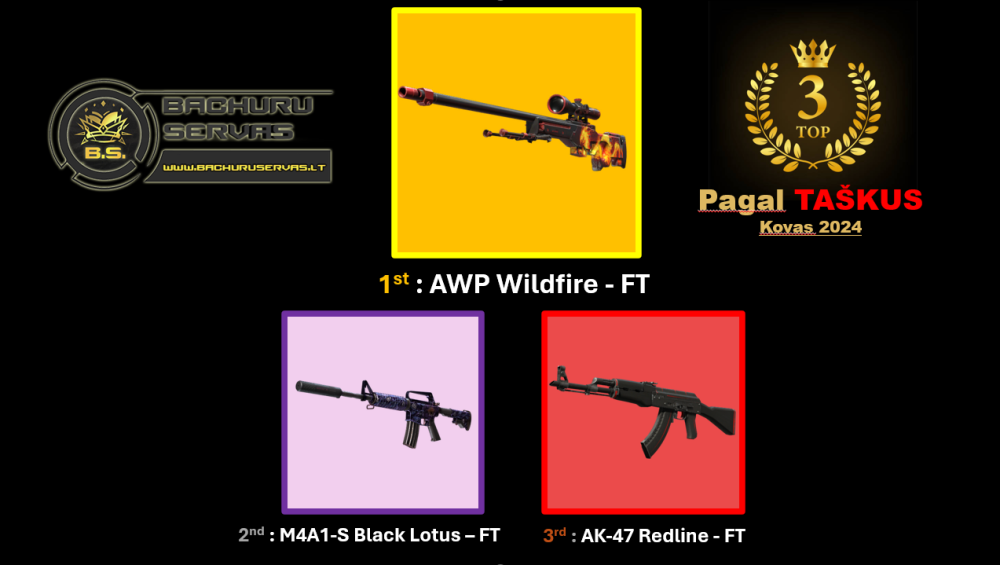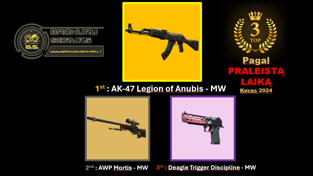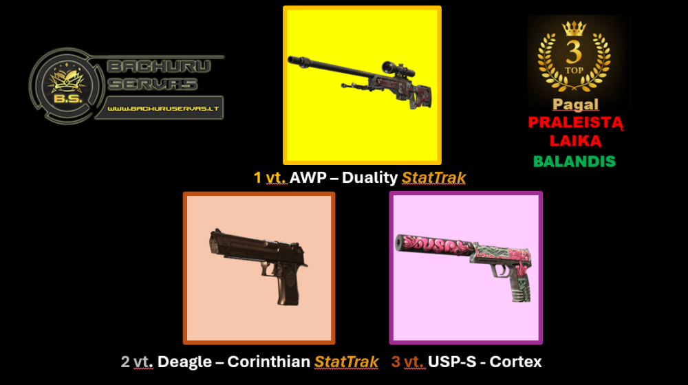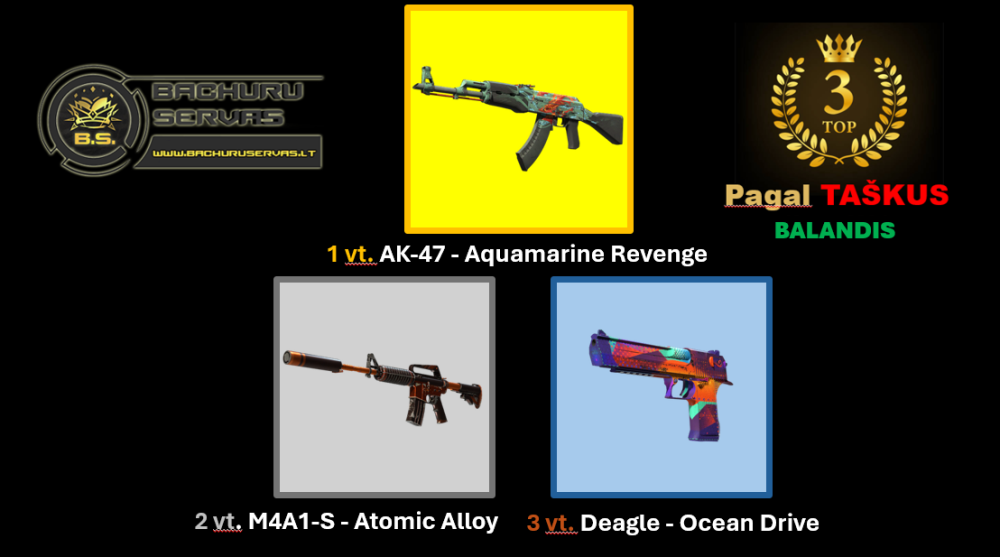 Bachūrų servo MĖNESIO BEST eventas! KOVO MĖNUO Kviečiame visus prisijungti į mūsų PUBLIC serverį, kur vyks dar vienas MĖNESIO BEST eventas! Serverio IP: cs.bachuruservas.lt:27035 Tai antras iš eilės toks eventas. Mėnesio pabaigoje bus apdovanoti TOP 3 geriausi žaidėjai pagal taškus (rank) bei TOP 3 geriausi žaidėjai pagal serveryje praleistą laiką. Savo poziciją pagal taškus galite sekti serveryje parašę !rank arba https://stats.bachuruservas.lt/toppoints/. Savo poziciją pagal laiką galite sekti https://stats.bachuruservas.lt/toppoints/?filter=playtime (pasirinkite, kad žaidėjus išdėstytų pagal PLAYTIME). Laimėtojai bus paskelbti “MĖNESIO BEST” Bachūrų servo discord’o kanale https://discord.gg/dDZfz5XV STARTAS: Kovo 1 d. 0:00 PABAIGA: Kovo 31 d. 21:00 SVARBU: Vasario mėnesio evento prizininkai GALI pretenduoti į apdovanojimus ! Adminai dėl prizų nesivaržo (jei bet kuris iš administracijos bus top3, prizai atiteks atitinkamai žemiau reitinge esančiam žaidėjui(-ams)) Taškų ir/ar praleisto laiko "farminimas" (pvz., per naktį paliekamas afk ar nuolatinis leidimas draugui būti nušautam ir pan.) = BAN !!! Žaiskite sąžiningai! Evente taip pat galios visos įprastos Bachūrų servo taisyklės: TAISYKLĖS Vienas žaidėjas gali pretenduoti tik į vieną prizų kategoriją (pvz., jei esate top3 tiek pagal praleistą laiką, tiek pagal taškus, galėsite atsiimti prizą tik už vieną iš kategorijų, o nepasirinktos kategorijos prizas atiteks sekančiam pagal reitingą žaidėjui). Prizai pagal taškus (rank): Prizai pagal serveryje praleistą laiką: Sėkmės !!! P.S. Like ant posto = +rep man. Jei negaila 😉