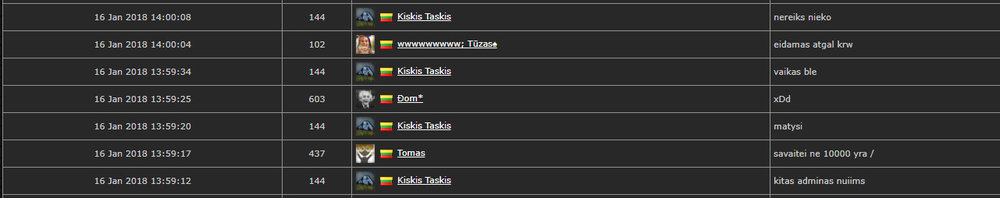 http://bachuruservas.eu/bans/index.php?p=commslist&advSearch=Kiskis Taskis&advType=name mute gavai už keiksmažodžio vartojima pastoviai kas antras žodis "blt" "kurva" "nx" pasakiau kad mažiau keiktusi man pasake: -neaiškink vaikas, kas tu man iš vis esi n* kad man čia kažka aiškintum, kažkokio pisliaus aš dar klausysiu. Gaves mute paraše man vistiek nuims mute koks skirtumas t.t. vos nepradejo jau gazdint apsimesti serverio verhu. O dabar jau "ar galit nuimt man mute" ispejima gavai tai gali neverkt dar pora dienu liko galesi vel kalbet. Gal ši karta pasimokei ir paklausysi manes (vaiko) kad nevartotum keiksmažodžius kas antram žodyje.