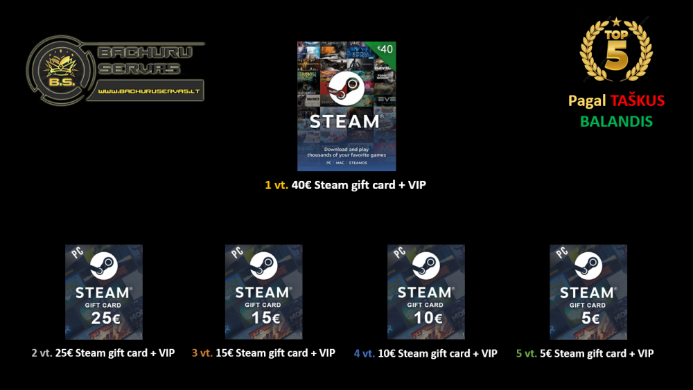 Bachūrų servo MĖNESIO BEST eventas! Balandžio MĖNUO Kviečiame visus prisijungti į mūsų PUBLIC serverį, kur vyks MĖNESIO BEST eventas! Serverio IP: cs.bachuruservas.lt:27035 Mėnesio pabaigoje bus apdovanoti TOP 5 geriausi žaidėjai pagal taškus (rank) , šį kartą už serveryje praleistą laiką prizų nebus. Savo poziciją pagal taškus galite sekti serveryje parašę !rank arba https://stats.bachuruservas.lt/toppoints/. Laimėtojai bus paskelbti “MĖNESIO BEST” Bachūrų servo discord’o kanale https://discord.gg/n2Gn5nCh STARTAS: Balandžio 1 d. 0:00 PABAIGA: Balandžio 30 d. 21:00 SVARBU: Ankstesnių mėnesių prizininkai GALI pretenduoti į apdovanojimus ! Adminai dėl prizų nesivaržo (jei bet kuris iš administracijos bus top3, prizai atiteks atitinkamai žemiau reitinge esančiam žaidėjui(-ams)) Taškų "farminimas" (pvz., nuolatinis leidimas draugui būti nušautam ) = BAN !!! Žaiskite sąžiningai! Evente taip pat galios visos įprastos Bachūrų servo taisyklės: TAISYKLĖS PRIZAI: Sėkmės! REZULTATAI 1. vt - youngas (3538 xp) - 40€ Steam gift card + VIP 2. vt - Cuki Cuki (3380 pt) - 25€ Steam gift card + VIP 3. vt - Cebur'ek (3285 xp) - 15€ Steam gift card + VIP 4. vt - ERDO (3208 xp) - 10€ Steam gift card + VIP 5. vt - mAh (3084 xp) - 5€ Steam gift card + VIP