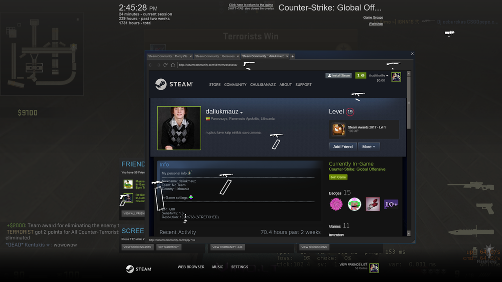 2. :D, Chuliganai - aš tave žaidime vos porą kartų esu sutikęs, prieš nė vieną žaidėją kol kas nieko prieš neturiu. Truputį pasikapstęs, sužinojau kelis dalykus konkrečiai. Pasirodo, jis tą nuotrauką buvo įkėlęs prieš 5 dienas kitoje temoje... Redagavęs bandė ištrint, bet pamiršo seną temą... (Kek) Patikrinęs log, ar tikrai jis įkėlė, radau o čia tas Untitled1.png, originalus failas, kurį pats chuliganas ir įkėlė. Situacija gan juokinga patapo man. O ginklai surfe mėtytis belekur ant žemės gali, mirus žmogui, lavonas dingsta po kurio laiko, bet ginklai lieka ant map apačios. P.S. man čia panašu, kad kilo Toweriu ant surf ski 2 map, nes p50 panašioj vietoj spawn yra, kiti ginklai panašu kad ant ilgosios trasos mėtosi, o awp šalia pačio tower, dažnas camp spotas.