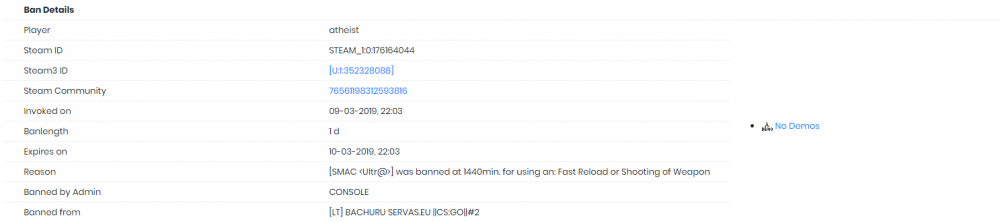 1. normie http://steamcommunity.com/id/_veX_/ 2. Ban'a dave šiandien, šitam serveryje 88.222.88.65:27030 ( de_train, apie 18:53 ) 3. Marrihuana 4. Gavau permanent ban'a dėl ' wh ' naudojimo, nors iš vis jo nenaudojau