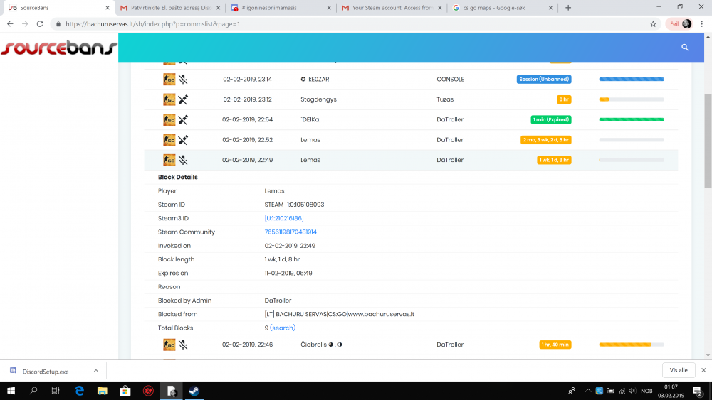 1. Vakar internetas neveikia kaip turėtų gal dėl to išmetė šitą... Pašalinkit Consolės klaidą ? Demo peržiūrėję įsitikinsit Player Lemas No Demos Steam ID STEAM_1:0:105108093 Steam3 ID [U:1:210216186] Steam Community 76561198170481914 Invoked on 05-02-2019, 20:09 Banlength 1 d Expires on 06-02-2019, 20:09 Reason [SMAC <Ultr@>] was banned at 1440min. for using an: Backtrack Exploit-Mode:A [NC] Banned by Admin CONSOLE Banned from [LT] BACHURU SERVAS.EU ||CS:GO||#2