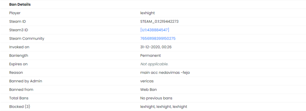 Jūsų Nick bei steam ID - lexhight https://steamcommunity.com/id/tradeban76561198399150275/Kada, kuriam mape ir kuriame serve nubaudė? ( 1, 2, DM ) - Retake'usKą darėte prieš gaunant baną - Buvome tryse serveryje žaidžiau gan gerai ir Fėja paprašė, kad atsiuščiau main acc kurio jau senai nebeturiu galvojau jau viska išsprendėm, nes kaip Fėja minėjo pažiurės ar turiu kitų accountu, pasikeitė mapas ir buvo gan vėlu ir serveryje nebuvo per daugiausiai žaidėju tai tiesiog nuėjau žaisti faceit'o kuriame su šituo accountu turiu jau 300 game'u. Po 2 mėnesiu bandau jungtis į serverį ir pamatau kad esu gaves bana turiu 420h ant šito accounto ir nemanau, kad su šitiek valandu accountas dar skaitosi naujas kuriame dar turiu skinu, passu ir dar visokio š.Kuris admin nubaudę ? - Fėja